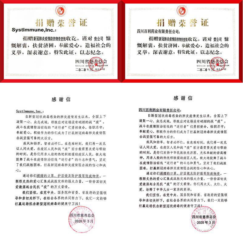 南昌伟祺智能社区服务有限公司携手美国西雅图免疫,中美企业共同通过四川慈善总会,向四川和湖北等一线医院分批次捐赠医用外科口罩和N95口罩、护目镜、防护服等防护用品。向全国几十家医院捐赠抗病毒药物新博林(利巴韦林颗粒)和提高免疫的好好黄芪颗粒等,助力一线医护抗疫